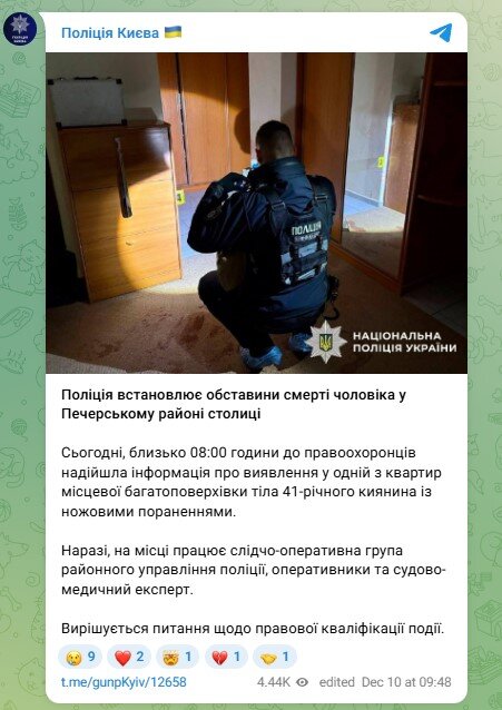 "Сьогодні, близько 08:00, до правоохоронців надійшла інформація про виявлення в одній із квартир місцевої багатоповерхівки тіла 41-річного киянина з ножовими пораненнями", - заявили в управлінні комунікації столичної поліції.