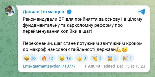 Зазначимо, що Національний банк виступив із пропозицією про перейменування ще восени 2024 року. Згодом голова НБУ Андрій Пишний офіційно звернувся до спікера парламенту Руслана Стефанчука з проханням винести відповідний законопроєкт на розгляд. Документ було зареєстровано 1 жовтня 2025 року.