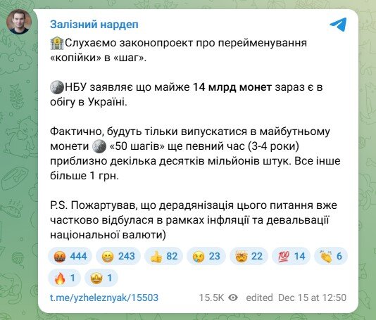 При цьому, за словами народного депутата Ярослава Железняка, наразі в обігу перебуває близько 14 мільярдів монет-копійок. У найближчі роки планується випускати лише монети номіналом "50 шагів".