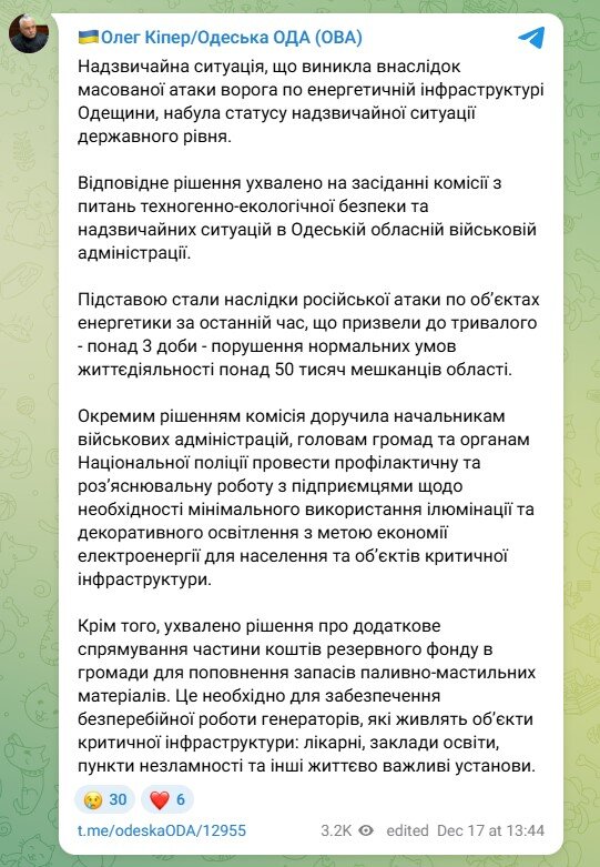 В Одесі та області оголошено надзвичайну ситуацію державного рівня через масовані удари по енергетичній інфраструктурі.