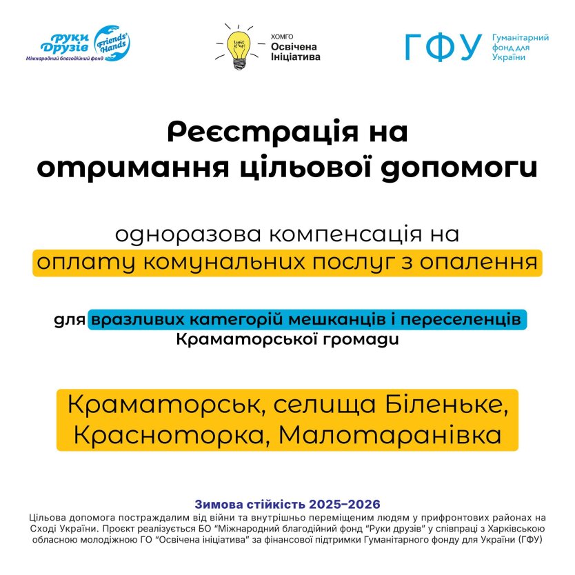 Жителі Краматорської громади з числа вразливих категорій населення можуть отримати одноразову грошову компенсацію для покриття витрат на опалення. Виплату у розмірі понад 19 тисяч гривень надасть міжнародний благодійний фонд "Руки друзів".