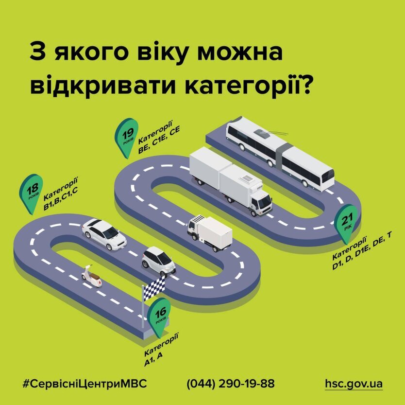 Як повідомляє Головний сервісний центр МВС, мопедами та мотоциклами можна керувати з 16 років, легковими автомобілями та вантажівками — з 18 років. Для категорій BE та CE (транспорт з причепом понад 750 кг) мінімальний вік становить 19 років, для автобусів категорії "D" — 21 рік.