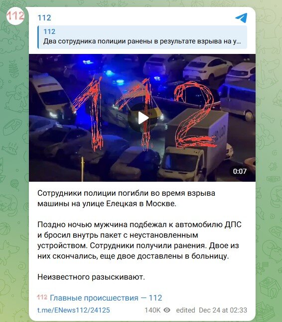 У ніч на середу, 24 грудня, у Москві на вулиці Єлецькій ліквідували двох співробітників Міністерства внутрішніх справ Росії, які брали участь у війні проти України і, зокрема, катували українських військовополонених.