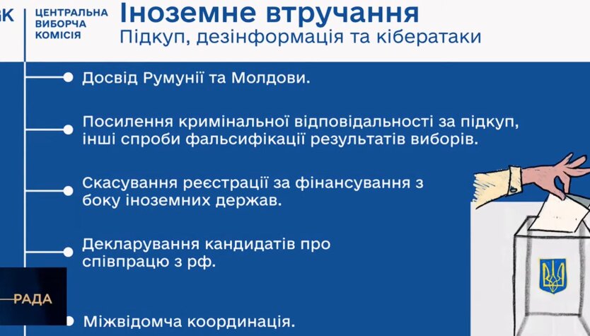 У ЦВК побоюються потужних кібератак, дезінформації та спроб підкупу з боку РФ. Щоб захистити вибори, Україна планує перейняти досвід Молдови: посилити кримінальну відповідальність за підкуп та роботу на країну-агресора, аж до зняття кандидатів з реєстрації за зв'язки з Росією.