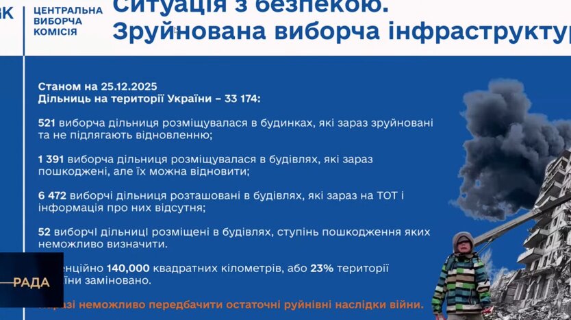 За словами Діденка, підготовка до виборів має розпочатися мінімум за шість місяців до дня голосування. Перші три місяці підуть лише на аудит: чи вціліли приміщення для дільниць і чи безпечно там перебувати. Ситуація критична: понад 1390 дільниць пошкоджено, а 6500 перебувають в окупації. До того ж, майже чверть території країни (23%) потенційно замінована.