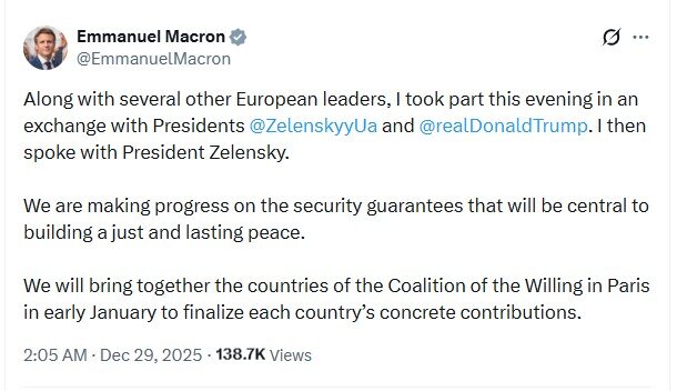 Зазначимо, що 28 грудня Трамп прийняв Зеленского у своїй резиденції Мар-а-Лаго. Переговори затягнулися до трьох годин замість запланованої однієї. Після цього обидва лідери провели консультації з європейськими колегами.