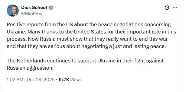 Прем'єр Нідерландів Схооф позитивно оцінив сигнали зі США щодо мирного врегулювання, але закликав Росію продемонструвати реальний намір завершити конфлікт і серйозно брати участь у переговорах про справедливий мир.