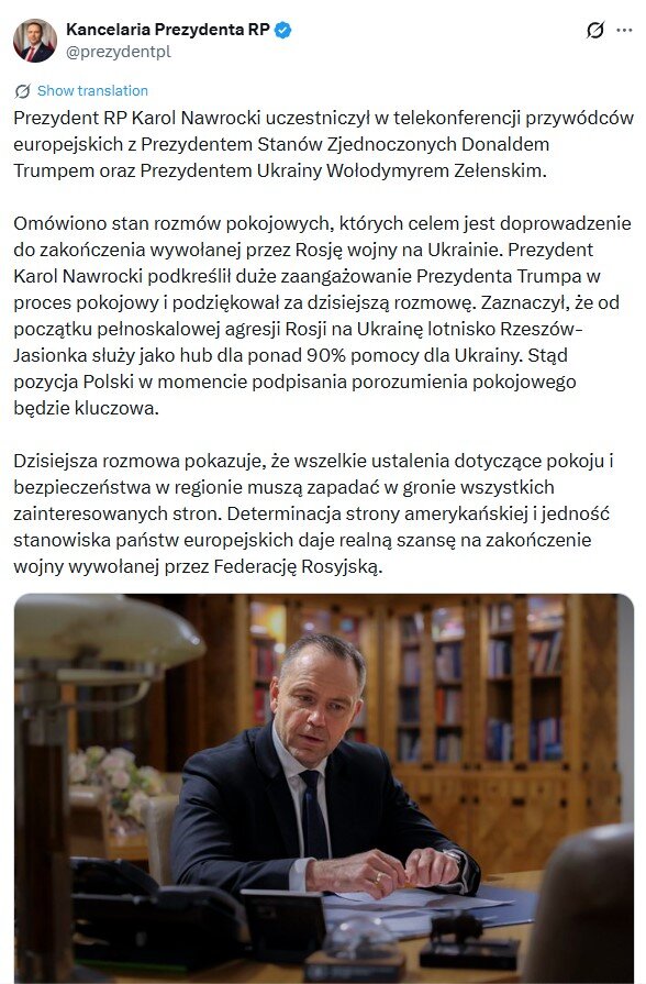 Польський президент Навроцький подякував американській стороні за активну участь у мирних ініціативах та організацію зустрічі. Він відзначив важливу роль Польщі у підтримці України, згадавши, що через аеропорт у Жешуві проходить понад 90% військової та гуманітарної допомоги Україні з початку війни.