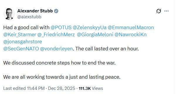 Президент Фінляндії Стубб повідомив про телефонну розмову тривалістю понад годину, під час якої обговорювалися конкретні заходи щодо припинення війни. Він наголосив на спільних зусиллях для досягнення справедливого та стійкого миру.