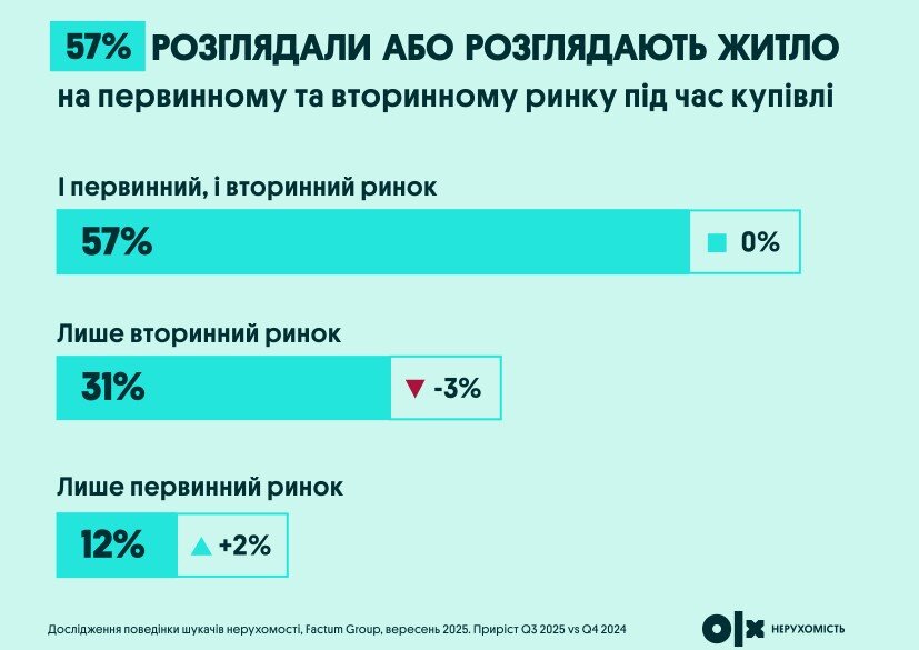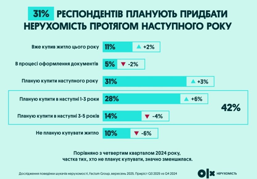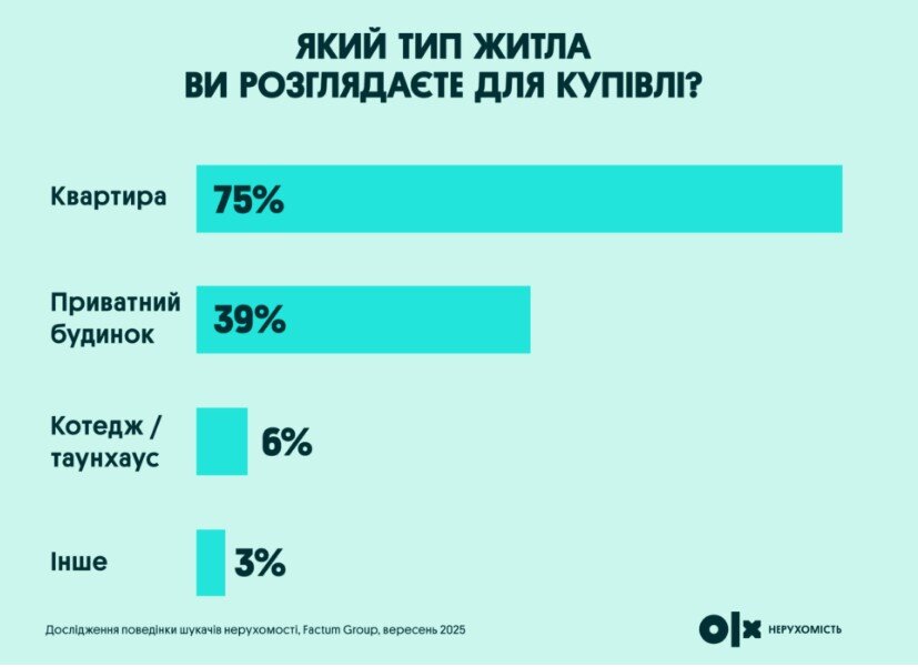 Згідно з річним звітом OLX Нерухомість, у 2025 році медіанна вартість квартир у продажу зросла на 19%. Найвищі ціни зберігаються у столиці та західних регіонах. При цьому сегмент приватних будинків зростав швидше: попит збільшився, а цінник піднявся на 27%.