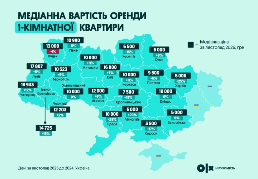 Як показують дані аналітики за період з листопада 2024 по листопад 2025 року, найбільш відчутний стрибок цін зафіксовано в Одесі та Харкові - там оренда подорожчала одразу на 25%. Водночас у Дніпрі, Запоріжжі, Рівному та Хмельницькому цінники залишилися на рівні минулого року.