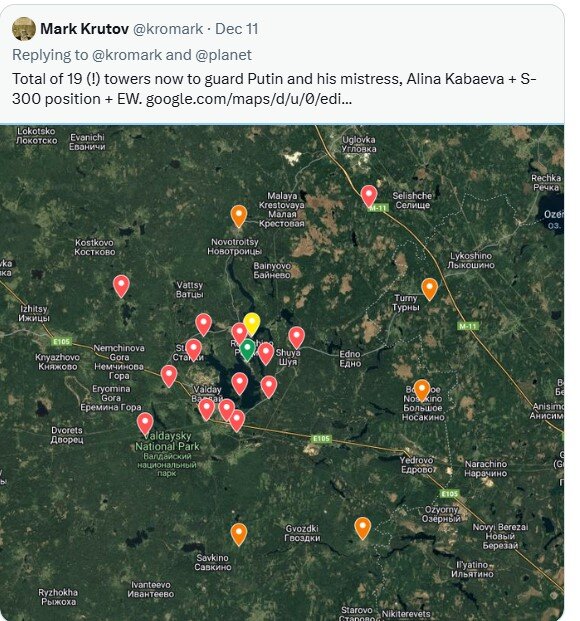 Тим часом журналіст "Радіо Свобода" Марк Крутов опублікував карту, що демонструє щільне кільце ППО навколо резиденції Путіна на Валдаї - об'єкта, який, за версією Кремля, зазнав атаки.