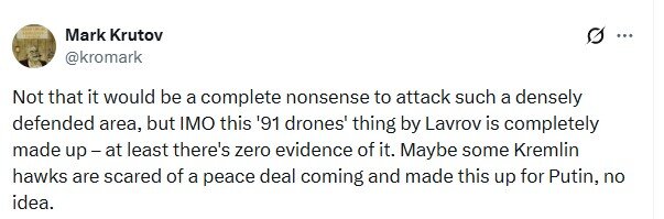 "Не те щоб удар по такому добре захищеному району був повним абсурдом, але історія Лаврова про "91 дрон", на мій погляд, повністю вигадана - принаймні, жодних доказів цьому немає. Можливо, деякі кремлівські яструби побоюються наближення мирної угоди і вигадали цю версію для Путіна", - зазначив Крутов.