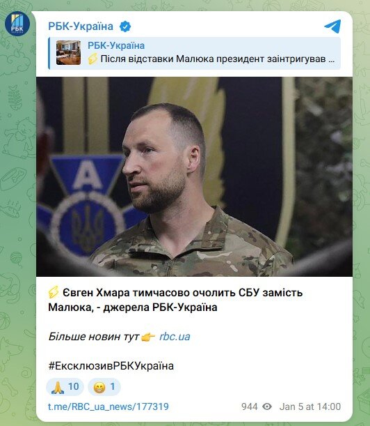 Тим часом джерела РБК-Україна повідомили, що Євген Хмара тимчасово очолить СБУ замість Малюка.