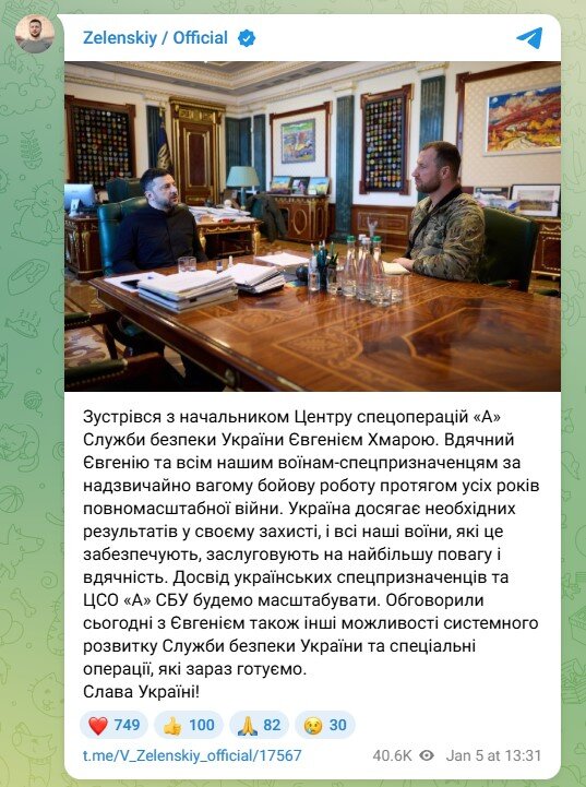 "Вдячний Євгену та всім нашим воїнам-спецпризначенцям за надзвичайно вагому бойову роботу протягом усіх років повномасштабної війни. Україна досягає необхідних результатів у своєму захисті, і всі наші воїни, які це забезпечують, заслуговують на найбільшу повагу та вдячність. Досвід українських спецпризначенців і ЦСО "А" СБУ масштабуємо. Обговорили сьогодні з Євгеном інші можливості системного розвитку Служби безпеки України та спеціальні операції, які зараз готуємо. Слава Україні!", - написав лідер України.