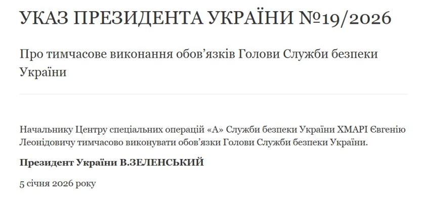 "Начальнику Центру спеціальних операцій "А" Служби безпеки України Хмарі Євгену Леонідовичу тимчасово виконувати обов’язки Голови Служби безпеки України", - йдеться в тексті документа.