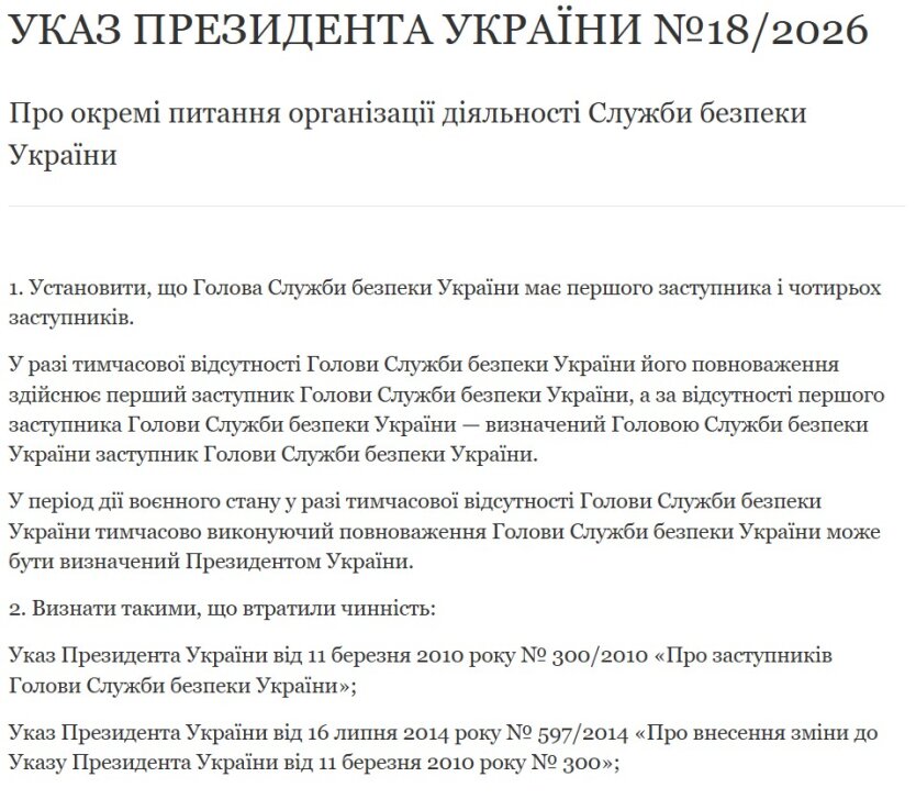 При цьому іншим своїм указом №18/2026 "Про окремі питання організації діяльності Служби безпеки України" Зеленський встановив, що: