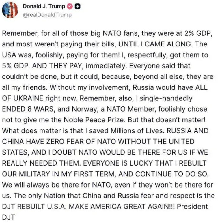 Президент США Дональд Трамп опублікував заяву щодо НАТО, витрат на оборону та ролі Сполучених Штатів у стримуванні Росії.