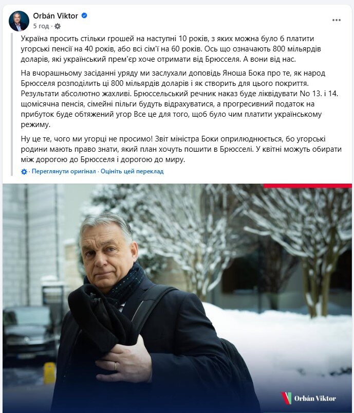 "На вчорашньому засіданні уряду ми заслухали доповідь міністра у справах ЄС Яноша Боки про те, як брюссельці розподілять ці 800 мільярдів євро і з чого вони створять для цього забезпечення. Результат доволі жахливий. Брюссельські укази скасували б 13-ту та 14-ту пенсійні виплати, скасували б сімейні допомоги та обклали б угорських платників податків прогресивним податком на доходи", - заявив прем'єр-міністр Угорщини.