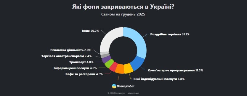 Найуразливішою сферою виявилася роздрібна торгівля - вона втратила 77 705 підприємців, що становить третину від загальної кількості закриттів. Такі бізнеси існують у середньому менш як три роки. На другому місці опинилася IT-сфера з показником 28 668 закритих ФОПів, хоча айтівці демонструють відносну стійкість, працюючи в середньому майже 4 роки.
