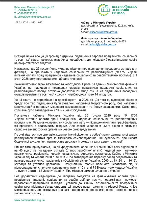 "Усі ці кошти не передбачені в держбюджеті на 2026 рік. До того ж, відповідні рішення уряду про такі підвищення були ухвалені наприкінці бюджетного року, без належних консультацій з органами місцевого самоврядування та їхніми асоціаціями. Саме тоді, коли вже було затверджено 97% місцевих бюджетів", - підкреслили в асоціації.