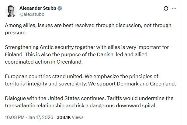 Президент Фінляндії Александр Стубб та прем'єр-міністр Норвегії Йонас Гар Стере виступили з жорсткою критикою намірів США запровадити торгові мита проти країн, які не підтримують ідею купівлі Гренландії. Лідери північних країн попередили, що мова економічного шантажу є неприпустимою між союзниками.
