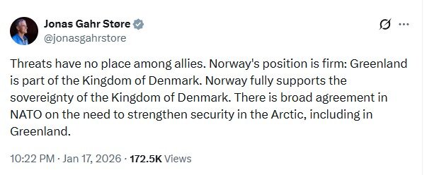 "Позиція Норвегії непохитна: Гренландія є частиною Королівства Данія... У НАТО існує широка згода щодо необхідності посилення безпеки в Арктиці, включаючи Гренландію", - написав глава норвезького уряду.