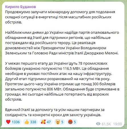 Україна отримає від Італії потужну допомогу для відновлення енергетичного сектору, який зазнав руйнувань через масовані російські атаки. Йдеться про передачу партії промислового опалювального обладнання.