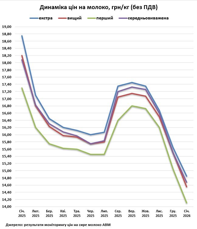 В Україні зафіксовано зниження закупівельних цін на молоко. Станом на 20 січня середня вартість сировини становила 14,35 грн/кг без ПДВ, що на 85 копійок менше порівняно з попереднім місяцем.