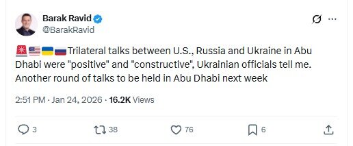 Зазначимо, що вчора, 23 січня, в Абу-Дабі стартували переговори за участю делегацій України, Росії та США. Українську сторону очолює секретар РНБО Рустем Умєров.