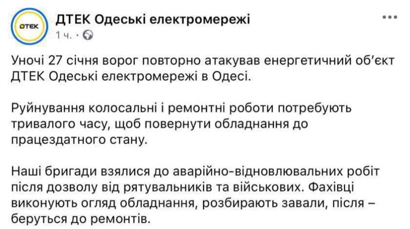 Під ударом цієї ночі опинилися також Львівська, Дніпропетровська, Миколаївська, Сумська та Харківська області. Ворог прицільно бив по критичній інфраструктурі. В Одесі ситуація з енергопостачанням залишається складною: в ДТЕК Одеські електромережі підтвердили повторний удар по енергетичному об'єкту та заявили про колосальні руйнування, які потребуватимуть тривалого ремонту.
