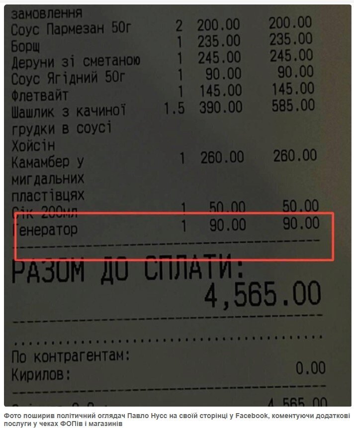Зазначимо, що раніше в соцмережах розгорілася дискусія після появи чека з ресторану, в якому клієнту окремим рядком нарахували плату за роботу генератора.