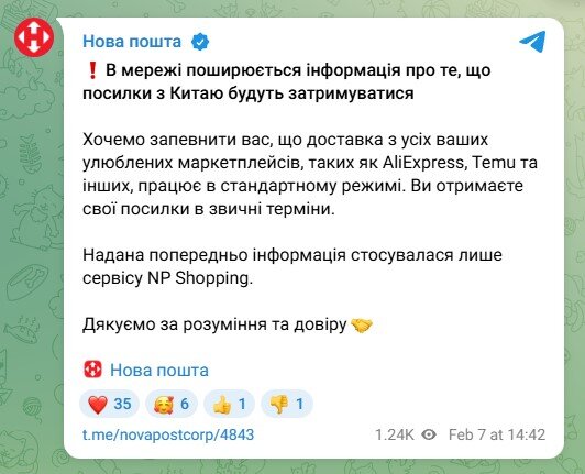"Хочемо запевнити вас, що доставка з усіх ваших улюблених маркетплейсів, таких як AliExpress, Temu та інших, працює у стандартному режимі. Ви отримаєте свої посилки у звичні терміни", - йдеться у заяві компанії.