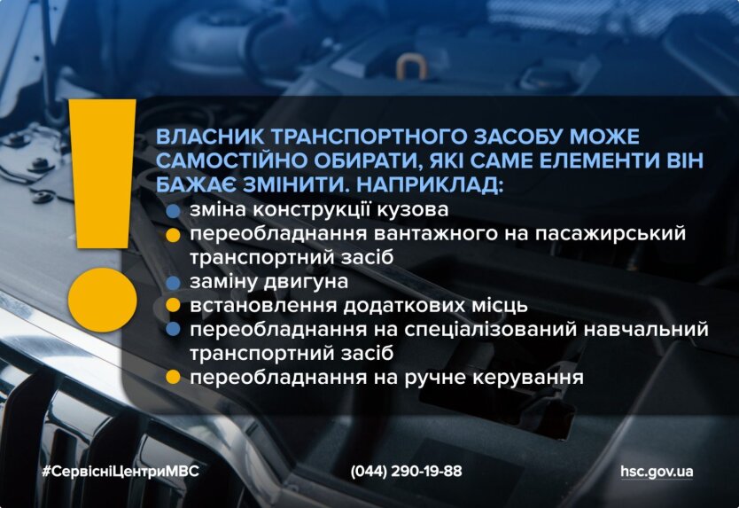 Законодавство чітко визначає: зміна типу двигуна, кузова, встановлення спецобладнання чи газобалонної системи - це переобладнання, яке не можна робити "тихо".
