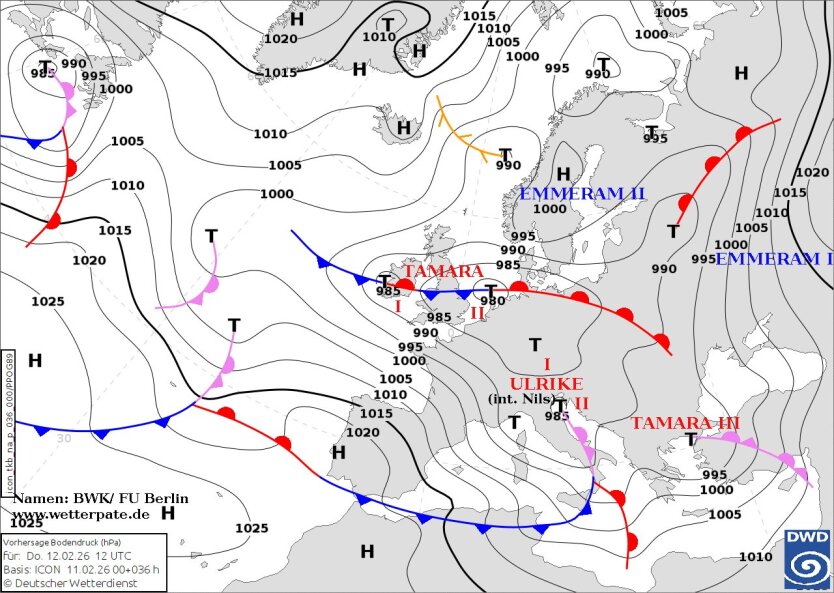 "Антициклон руйнується, тане, морози розчиняються, вологі теплі циклони наступають – карта внизу. Нагадую: червоні лінії з "вушками" – теплі атмосферні фронти, сині з колючками – холодні атмосферні фронти", - зазначила синоптикиня.