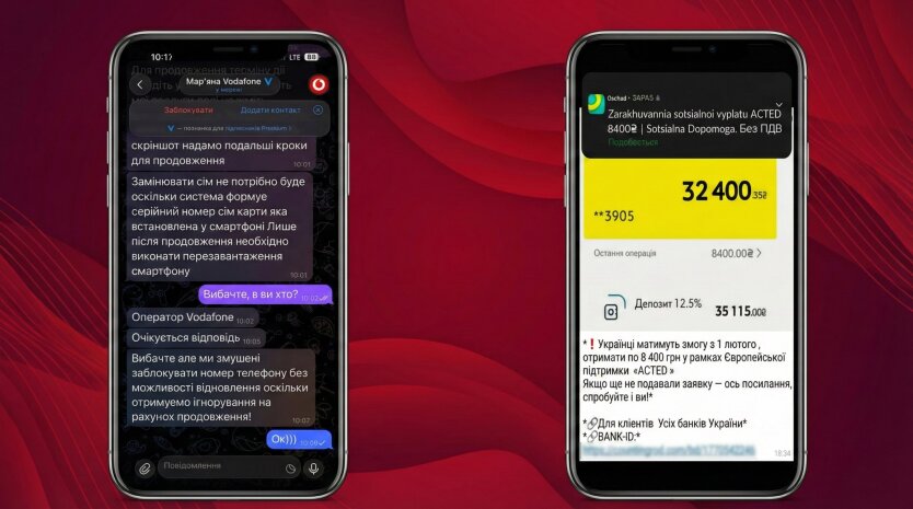 Перша схема стосується безпосередньо послуг зв'язку. Зловмисники створюють фейкові акаунти під брендом Vodafone і розсилають повідомлення про нібито "завершення терміну дії номера".