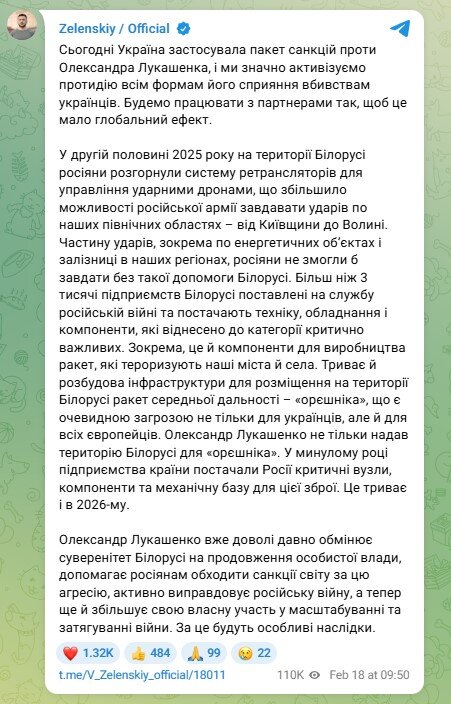 Президент уточнив, що Лукашенко не просто надав територію для ракетних комплексів. Протягом минулого року підприємства Білорусі постачали РФ критичні вузли та механічну базу для цієї зброї, і ці постачання тривають у 2026 році.